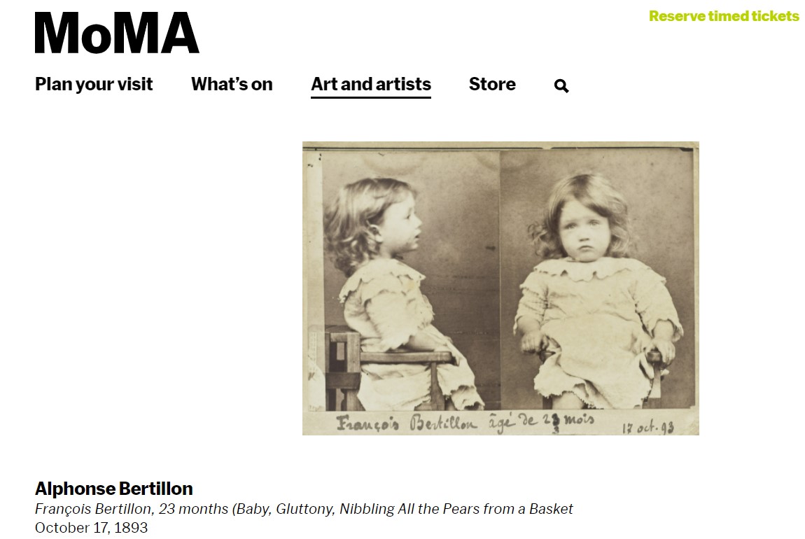 Görseli detaylı bir şekilde arattığımızda karşımıza iddiaları çürüten birçok kaynak çıktı. Öncelikle fotoğrafın hemen altında ‘Francois Bertillon âge de 23 mois’ yazısının bizleri karşıladığını görüyoruz. Bu yazıyı arama motorlarında Francois Bertillon şeklinde kısaca taradığımızda bahsi geçen fotoğrafın kaydının New York’ta bulunan Modern Sanat Müzesi’ne (Museum of Modern Art) ait olduğunu gördük. Görseldeki bebeğin isminin gerçekten de Francois Bertillon olduğu bilgisine de buradan erişmiş olduk.