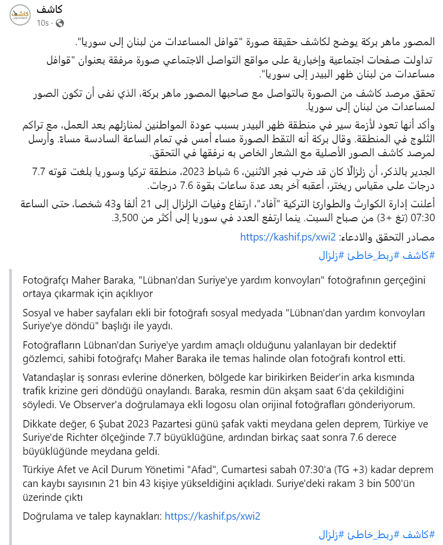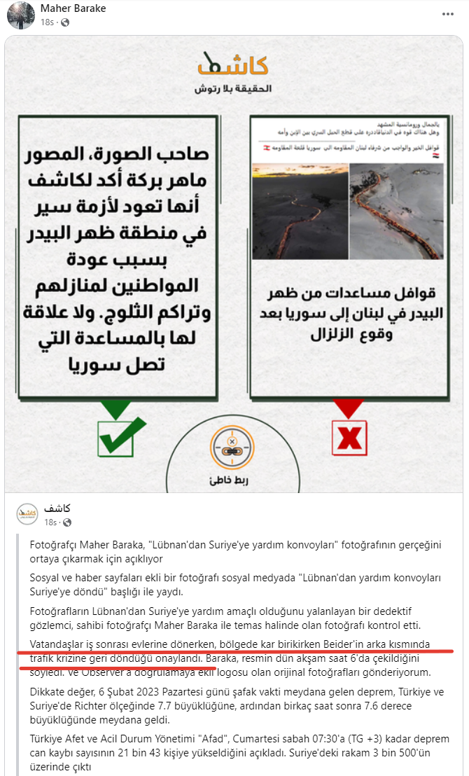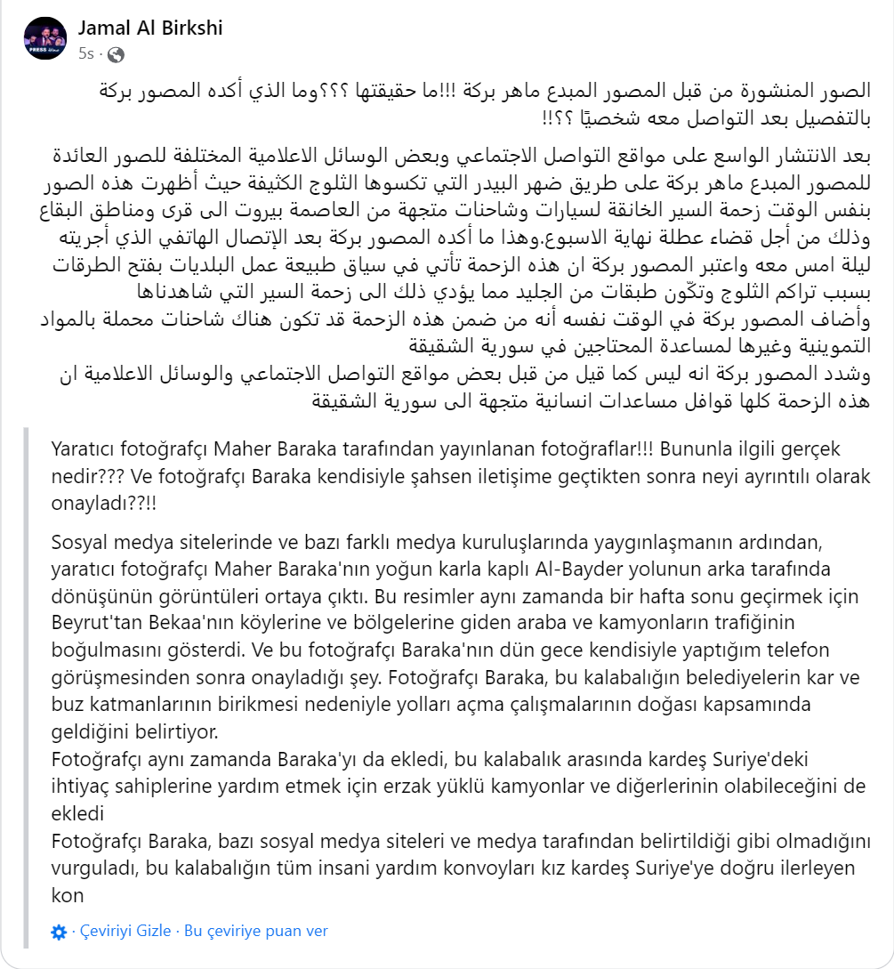 Maher Baraka, fotoğrafların bağlamından çıkarılarak paylaşıldığını fark edince iddianın yanlış olduğunu belirten bir doğrulama ekibinin paylaşımını da hesabı üzerinden paylaştı. Aynı ekibe yaptığı açıklamada, fotoğrafın iş çıkışı trafiğini gösterdiğinin altını çizmiş.