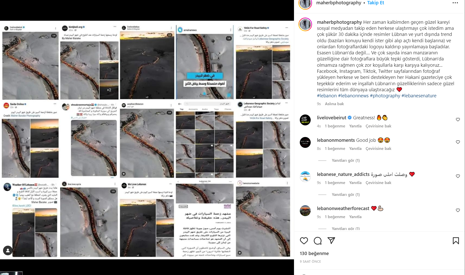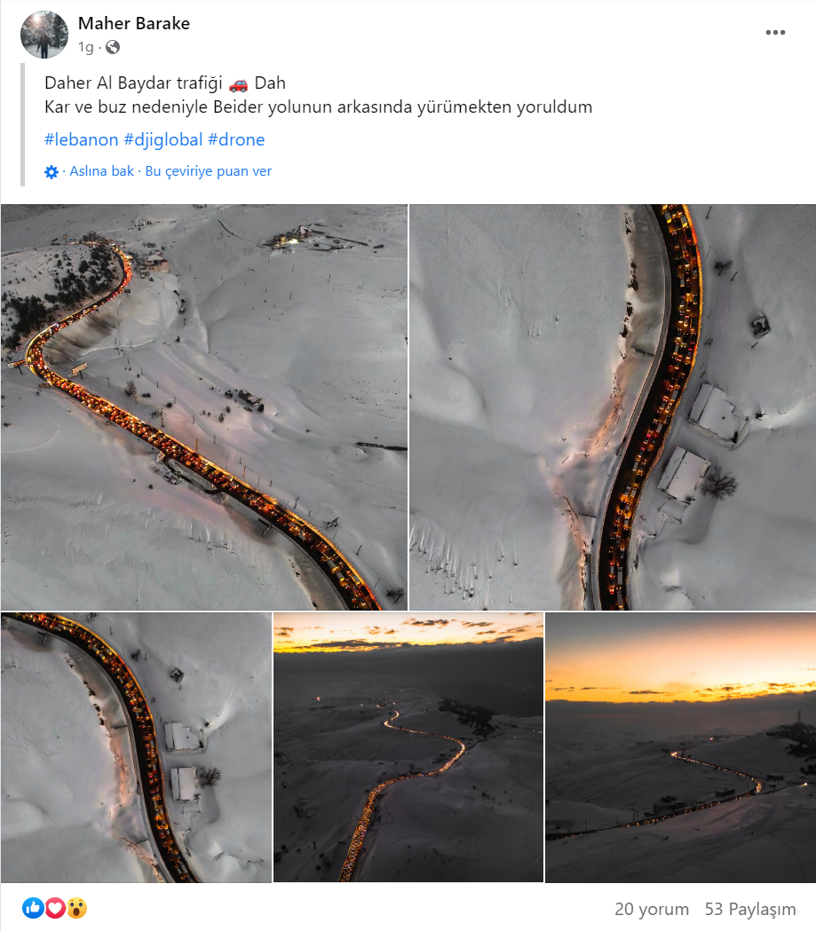 Fotoğraf, Maher Barake tarafından 10 Şubat’ta Facebook’ta paylaşıldı. Paylaşımın açıklama kısmına, “Daher El Baydar trafiği / Kar ve buz nedeniyle Beider yolunun arkasında yürümekten yoruldum.” notunu yazdı.