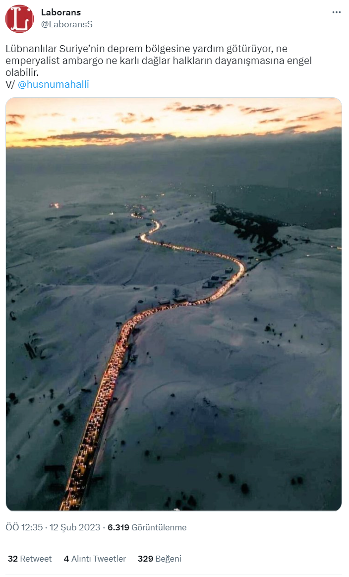 6 Şubat depremi Türkiye’deki 10 il ile birlikte Suriye’yi de etkiledi. Her iki ülkeye de diğer devletlerden yardım geliyor. Bir fotoğraf seti, sosyal medyada Suriye’ye yardım götüren Lübnan konvoyunu gösterdiği iddiasıyla paylaşıldı.