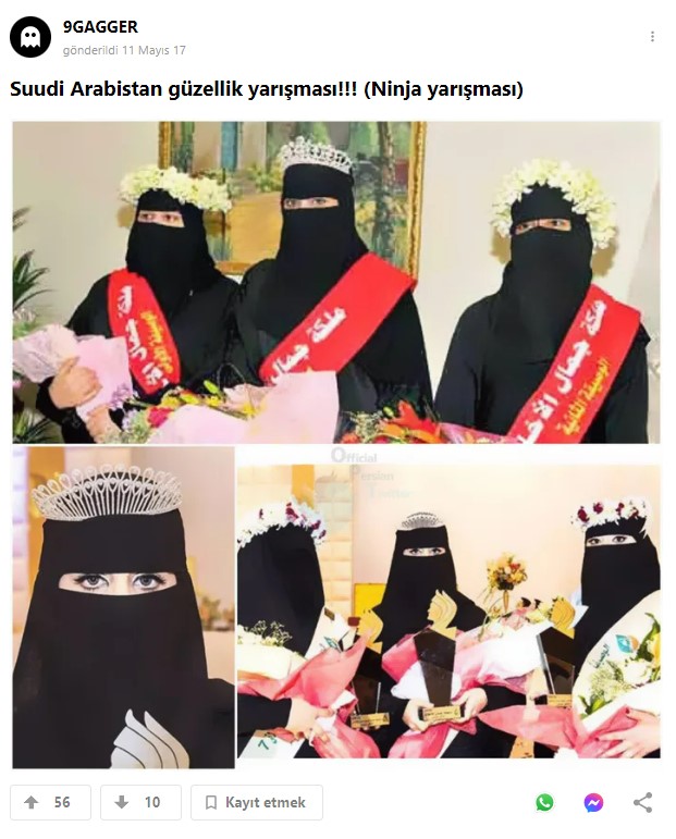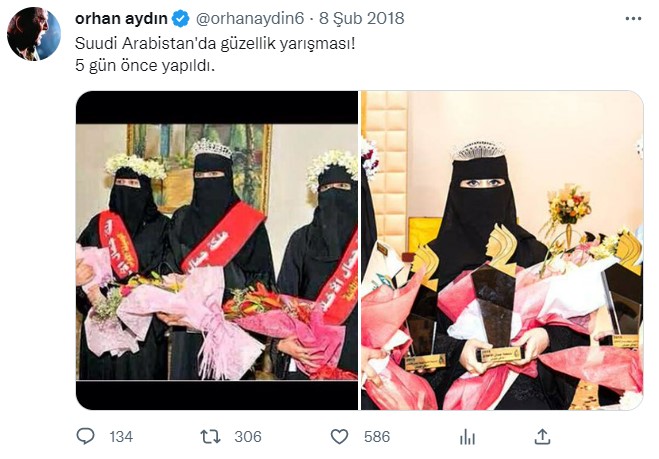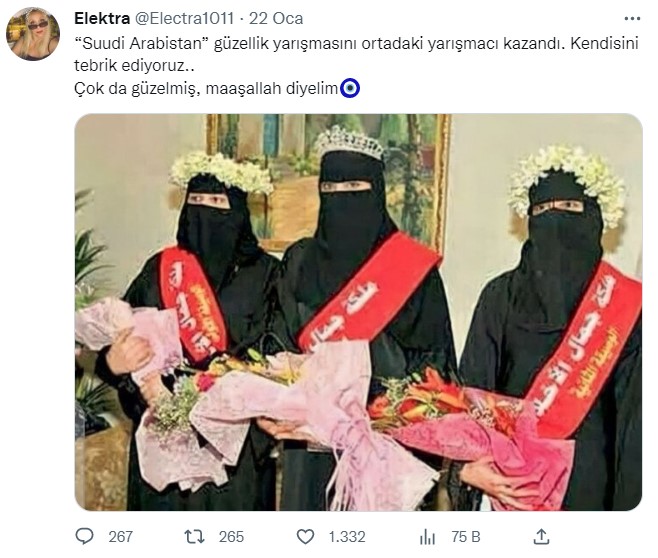 Twitter’da rastladığımız, tesettürlü üç kadının yer aldığı bir fotoğraf, 75 binden fazla görüntülenme alarak kısa sürede viral oldu. Söz konusu iddiaya göre fotoğraf, Suudi Arabistan’da düzenlenen ‘güzellik yarışmasını’ gösteriyor. İddiaya göre fotoğrafta ortada yer alan kadın ise bu yarışmanın birincisi seçilmiş. İddia sahibi, paylaşımına şu notu eklemiş:
