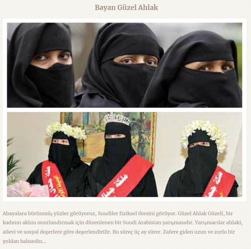 Dolayısıyla iddia edilenin aksine paylaşımlarda yer alan organizasyon ‘güzellik’ değil, ‘ahlaki güzellik’ üzerine bir yarışma. Organizasyon sahipleri, katılımcılarda sosyal yaşantı ve aileyle uyum gibi etik normlara yönelik bir dizi ölçütü referans alarak sıralama yapıyor.