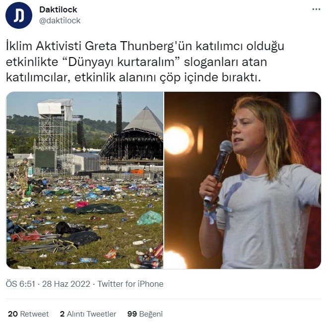 Greta’nın yaptığı açıklamaların ardından sosyal medyada paylaşılan birkaç fotoğraf ortaya çıktı. Söz konusu fotoğraflardaki bilgilendirmeye göre, festival alanının çöplerle bırakıldığı bunun gerekçesi ise Greta Thunberg’in konuşması olduğu öne sürüldü.
