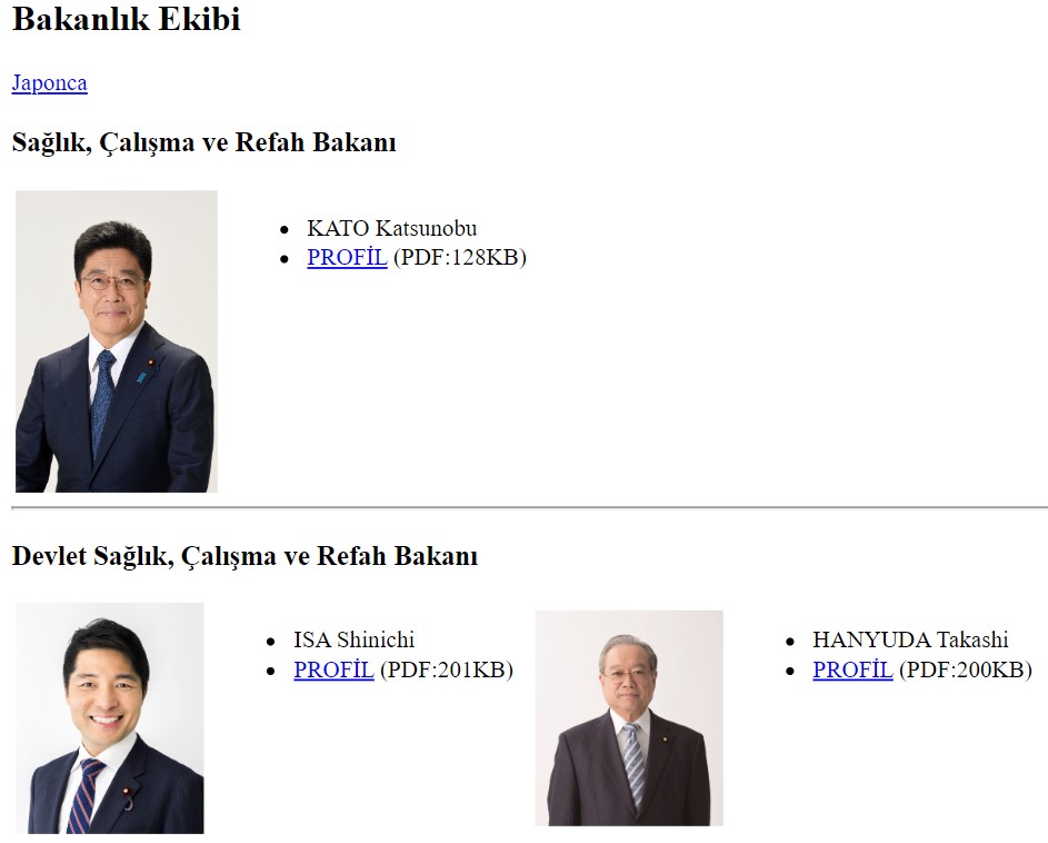Paylaşımla ilgili detaylı bilgi edinmek için Japonya Sağlık, Çalışma ve Refah Bakanlığı ile ilgili de internette araştırma yapıyoruz ve ulaştığımız sayfadan bakanları görüntüleyebiliyoruz.