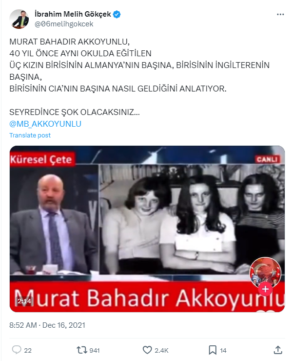 İddiaya üç genç kızın yan yana durduğu siyah-beyaz bir fotoğraf da eklendi. Her ne kadar iddia Aralık 2023’te paylaşılmış olsa da iddianın aslen bu üç ismin görev başındayken ortaya atıldığını söylemek mümkün. Konu ile ilgili internet taraması yapıldığında da iddia 2018 yılına dek takip edilebiliyor. Öte yandan 2021’de Melih Gökçek’in de Murat Bahadır Akkoyunlu’ya ait iddia kaynağı videoyu kullanarak benzer bir iddiada bulunduğu görülüyor. Söz konusu iddia paylaşımlarının yoğunlaştığı 2018 yılında, İngilizce paylaşımlar da bulunuyor.