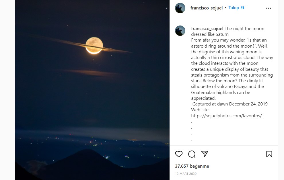 - Fotoğraf, Mart 2020’de Francisco Sojuel tarafından paylaşıldı. Sojuel, paylaşımın açıklama kısmına “Ay’ın Satürn gibi giyindiği gece” açıklamasını yazdı.