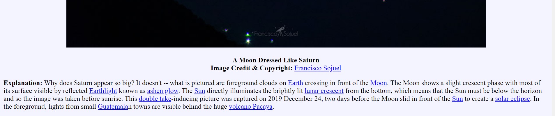 İlk olarak görseli tersine görsel arama tekniği ile taradığımızda NASA’nın o güne özel astronomik fotoğraflar paylaştığı apod.nasa sitesini bulduk. Sitede, fotoğrafı çeken kişinin ismi verilmiş. Açıklama kısmına ise fotoğrafın ilk bakışta Satürn gibi görünse de aslında Ay olduğu yazılmış.