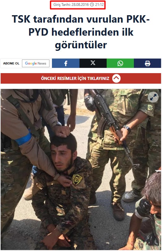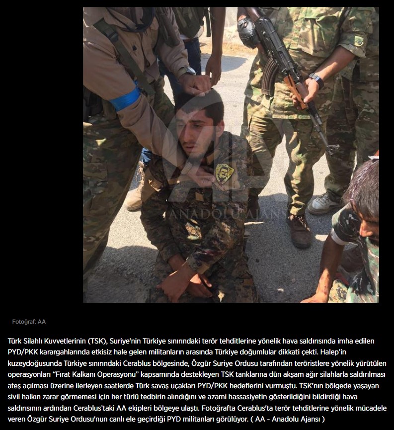 İlk olarak Anadolu Ajansı’nın yayınladığı görüntülerin, TSK’nın 24 Ağustos 2016’da başlattığı Fırat Kalkanı Operasyonu dahilinde kaydedildiği sonucuna ulaşıyoruz. Söz konusu görselde kimliği belirtilmeyen kişinin, Özgür Suriye Ordusu’nun (ÖSO) yakaladığı bir PYD’liyi gösterdiği aktarılıyor.