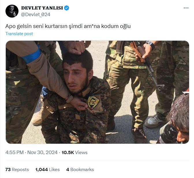Söz konusu bir paylaşımda yakalanan bir milis gücü güncel olaylarla ilişkilendirildi. Bahse konu kişinin yakasında yer alan “Reber Apo”, Türkçesiyle “Önder Apo” yazan bir apolet dikkatleri çekti.