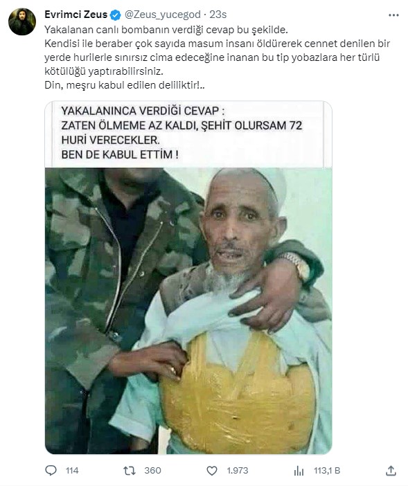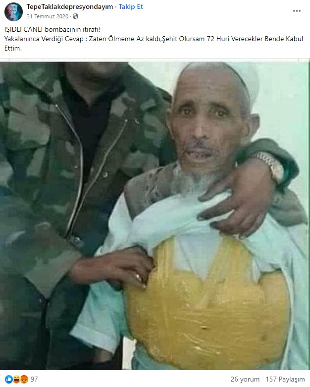 Geçtiğimiz günlerde X’te bir görsel yayılıma girdi. Birçok kullanıcı tarafından etkileşime giren bu görüntü kısa sürede viral oldu. Paylaşımlarda kimliği belirsiz bu kişinin, üzerinde sözde bomba ile yakalanınca “Zaten ölmeme az kaldı, şehit olursam 72 Huri verecekler ben de kabul ettim.” dediği iddia edildi.