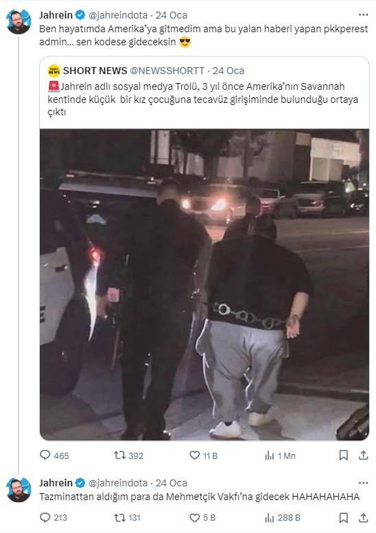 “Ben hayatımda Amerika’ya gitmedim ama bu yalan haberi yapan pkkperest admin… Sen kodese gideceksin. Tazminattan aldığım para da Mehmetçik Vakfı’na gidecek HAHAHAHAHA”