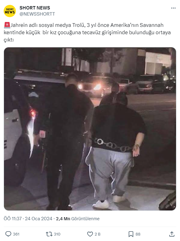 Elleri arkadan kelepçeyle bağlı bir kişinin görüntüsünün “Jahrein’e” ait olduğu öne sürülürken, buna ek olarak 3 yıl önce ABD’nin Savannah kentinde küçük bir kız çocuğuna sözde tecavüz girişiminde bulunduğu da iddia edildi.