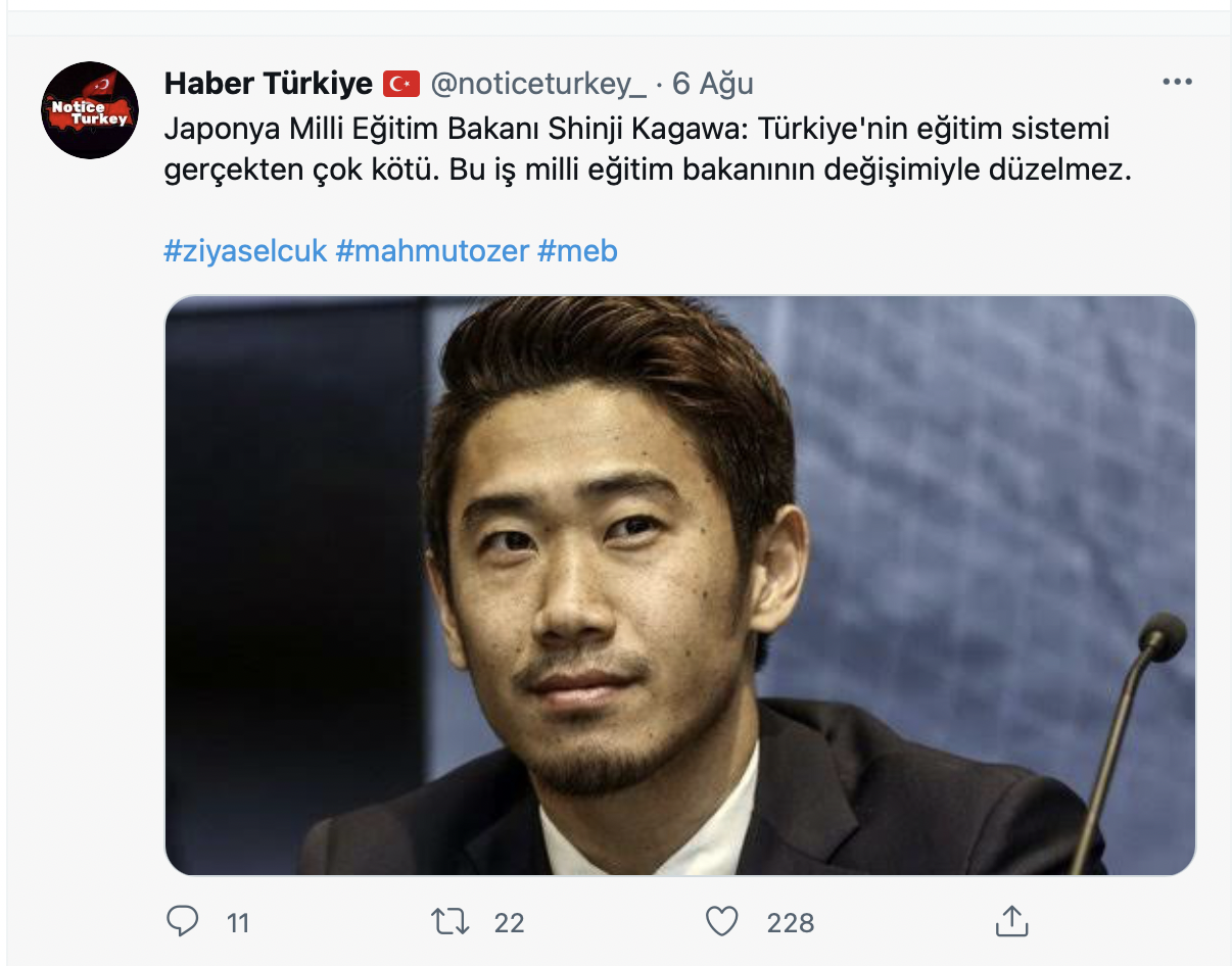 Milli Eğitim Bakanı Ziya Selçuk’un 06.08.2021 tarihinde istifasının açıklanmasının ardından #ziyaselcuk etiketi Twitter’da TT oldu. Bu etiketin altında ise @tinerihenry adlı bir Twitter kullanıcısının bir tweeti binlerce beğeni aldı. Paylaşımda Japon Milli Eğitim Bakanı olduğu iddia edilen bir kişinin “Türkiye’nin eğitim sistemi gerçekten çok kötü. Bu iş milli eğitim bakanının değişimiyle düzelmez” dediği öne sürüldü. Peki iddialar ne kadar doğru? Fotoğraftaki kişi kim? Ve yukarıdaki sözler gerçekten söylendi mi?