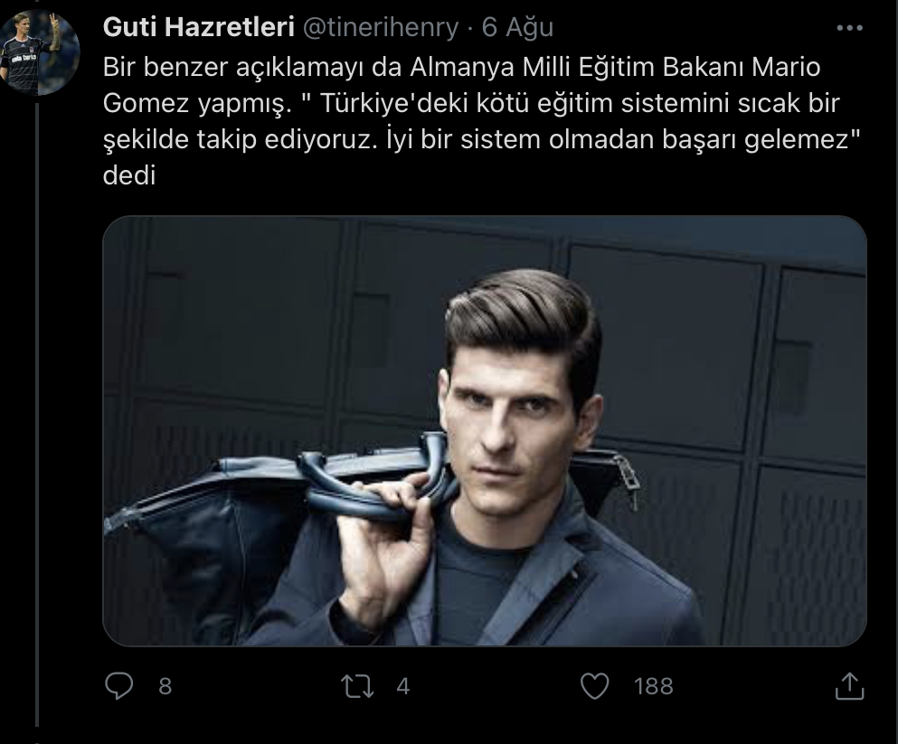 Tweet’i paylaşan @tinerihenry (Guti Hazretleri) isimli sayfanın tweeti mizah amaçlı paylaştığı anlaşılıyor. Sayfanın benzer bir şekilde Alman Milli futbolcu Mario Gomez’i Almanya Milli Eğitim Bakanı olarak göstererek sözde demeçlerine yer verdiği başka paylaşımları da var.