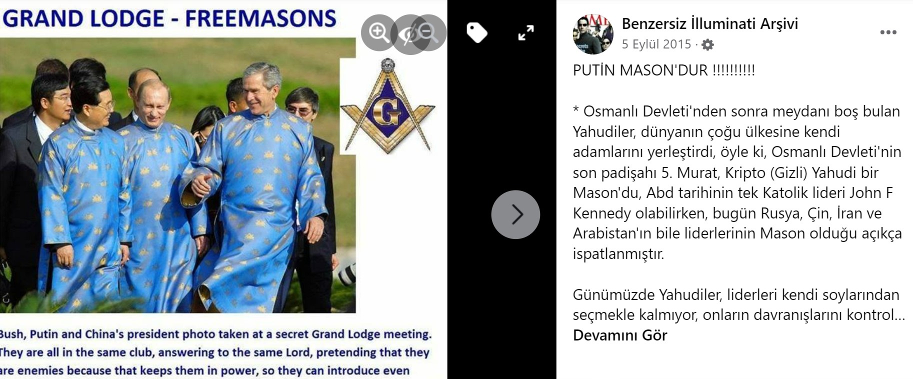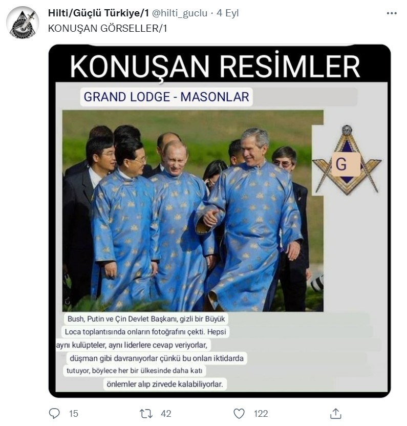 Grand Lodge – Masonlar. Bush, Putin ve Çin Devlet Başkanı, gizli bir Büyük Loca toplantısında onların fotoğrafını çekti. Hepsi aynı kulüpteler, aynı liderlere cevap veriyorlar, düşman gibi davranıyorlar çünkü bu onları iktidarda tutuyor, böylece her biri ülkesinde daha katı önlemler alıp zirvede kalabiliyor.