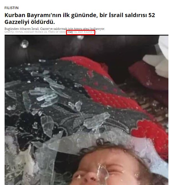 Peki bu olayla ilişkilendirilen fotoğraf gerçeği yansıtıyor mu? Yaptığımız görsel taramalarında bu fotoğrafın eski tarihlerde bazı haber kaynaklarında paylaşılmış olduğunu görebiliyoruz. Fotoğraf, Mayıs 2021’de Gazze’de İsrail askerleri ile Filistinli’ler arasında yaşanan çatışmalarla ilişkili.