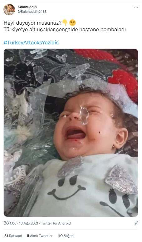Türk Silahlı Kuvvetleri’nin Kuzey Irak’ın Sincar bölgesine havadan operasyon düzenlediğine yönelik haberler bazı dijital mecralarda yer aldı. Bu haberlerin ardından sosyal medyada #TurkeyAttacksYazidis adlı hashtag ile çeşitli iddialar ve görüntüler paylaşılmaya başlandı. Bazı sosyal medya hesaplarınca paylaşılan yaralı bir bebek görselinin Sincar’da “TSK’nın bir hastaneyi bombalaması sonucunda” çekilmiş olduğu iddia edildi.
