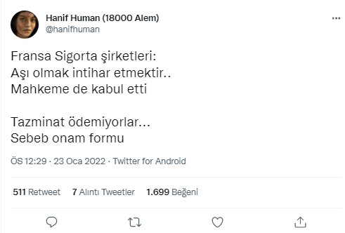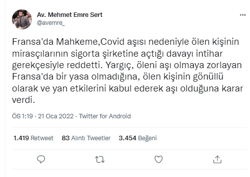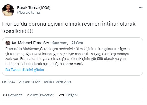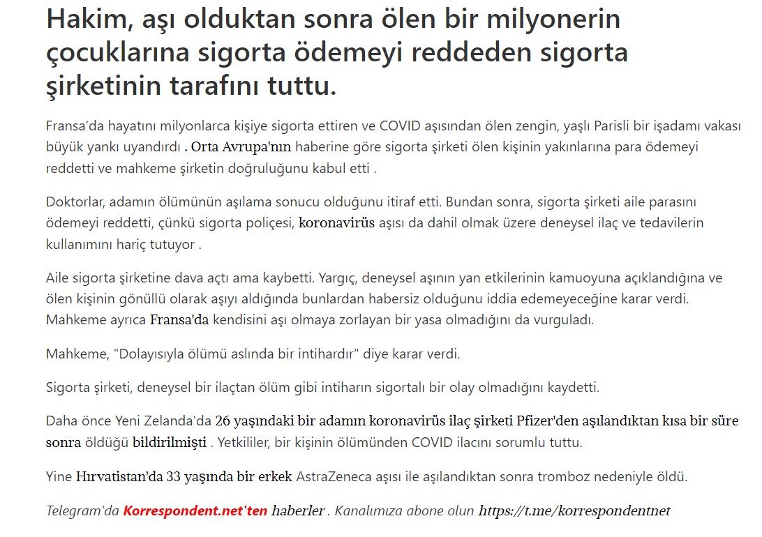 Sosyal medyada yayılan bir iddiaya göre Fransa’da milyoner bir kişi aşı yaptırdıktan sonra hayatını kaybetti, sigorta şirketi milyonerin mirasçılarına ödeme yapmayı reddetti, mirasçılar olayı mahkemeye taşıdı ve mahkeme ise sigorta şirketini haklı buldu. İddia Rus sosyal medyası VK’da ortaya atıldı. Fransız astrolog Philippe Weber ise bu iddiayı Tik Tok’ta dile getirdi. Bunun sonrasında ise iddia yayıldı.