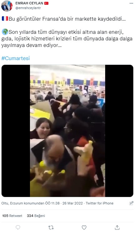 Geçtiğimiz günlerde sosyal medyada herkesin konuştuğu bir videoya denk geldik. Videonun, haber siteleri ve Twitter kullanıcıları tarafından yayılımda olduğunu gördük. Paylaşanlar, Fransa’daki bir markette gerçekleşen ayçiçek yağı izdihamı olduğu görüşünde. Bazı haber siteleri bu görüntülerle ilgili olarak, 1 litre ayçiçek yağı için kavga eden Fransızlar diye paylaşım yapmıştı. İlgili videonun TRHaber tarafından da Fransa’da yaşanan güncel bir olaymış gibi aktarıldığı bilgisini vermiş olalım.