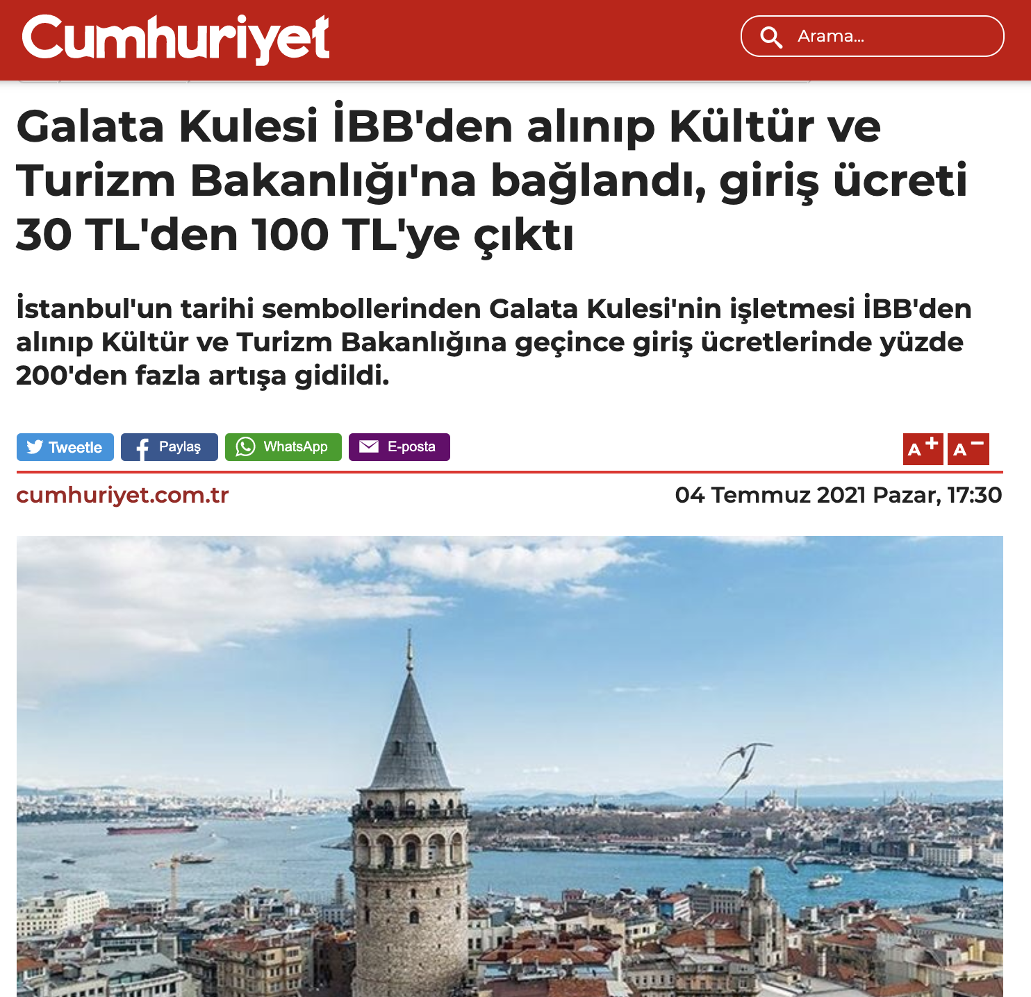 İBB’nin Galata Kulesi sözleşmesi 2019 yılının sonunda bitti. Ve, 2020 yılında Galata Kulesi Kültür ve Turizm Bakanlığı’na bağlanmıştır. 2019 yılında Galata Kulesi’ne giriş için tam ücret 15 TL, öğrenci ücreti 7,5 TL’dir. 2020 yılında tam ücret 7,5 TL’dir. 2021 yılında Temmuz ayından önce ise giriş ücreti 30 TL’dir. Temmuz ayı sonrasında ise 100 TL olmuştur. Fakat Galata Kulesi’ne Müzekart+ ile de girilebiliyor. Türk vatandaşlarına Müzekart+ ücreti ise 60 TL’dir. Müzekart+ ile de bir yıl boyunca 300’den fazla müze ve ören yerine ücretsiz ziyaret edilebilir. Her koşulda her vatandaşı Galata Kulesini 100 TL’ye ziyaret edeceği’ algısını desteklemiştir.