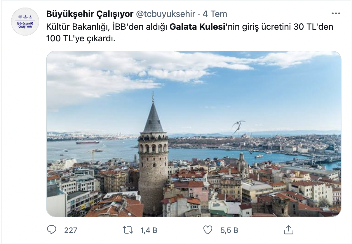 Pek çok haber sitesinin iddiasına göre Galata Kulesi Kültür ve Turizm Bakanlığı’na bağlandıktan sonra giriş ücretinin 30 TL’den 100 TL’ye çıktı. Ayrıca haber siteleri Galata Kulesi’nin eski giriş ücretinin 30 TL olduğu bilgisine de yer verdi. Giriş ücreti 30 TL olduğu zamanlarda kuleyi BELTUR işletiyordu. İddia Twitter’da da yankı uyandırdı. İddia ile Ekşi Sözlükte de konuyla alakalı başlık açıldı.