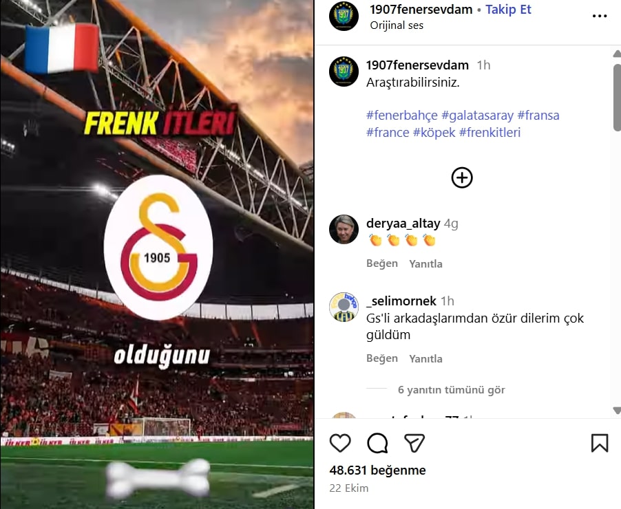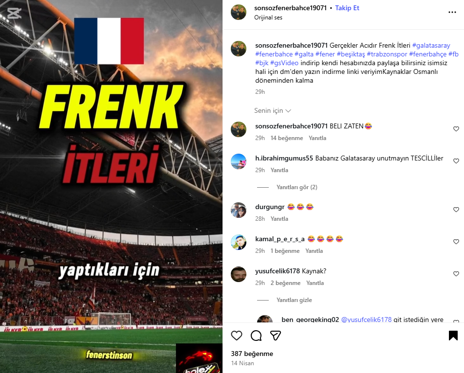 Sosyal medyada Galatasaray ile ilgili bir video yayılıma girdi. İddiaya göre 1960’lı yıllara kadar Galatasaray’ın lakabı “Frenk İtleri” imiş. Bunun nedeni olarak da Osmanlı’nın son dönemlerinde kurulan takım Fransızlara savaş döneminde çok yardım etmiş. Bunun sonucunda Osmanlıcada Fransız demek için kullanılan Frenk ve Fransızlara yardım ve yataklık yaptıkları için itleri denmiş.