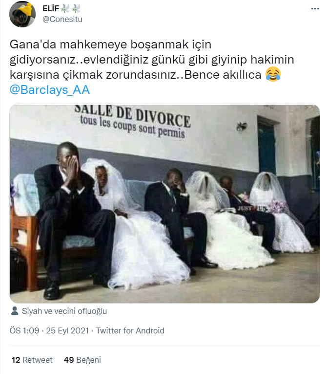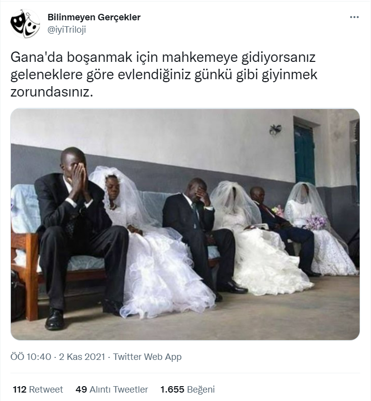Gelinlik ve damatlık giymiş çiftlerin bir mekanda oturdukları görünen fotoğrafın yer aldığı paylaşımda, Gana’da mahkemeye boşanmak için giden çiftlerin evlendikleri günkü gibi giyinmek zorunda oldukları belirtiliyor.