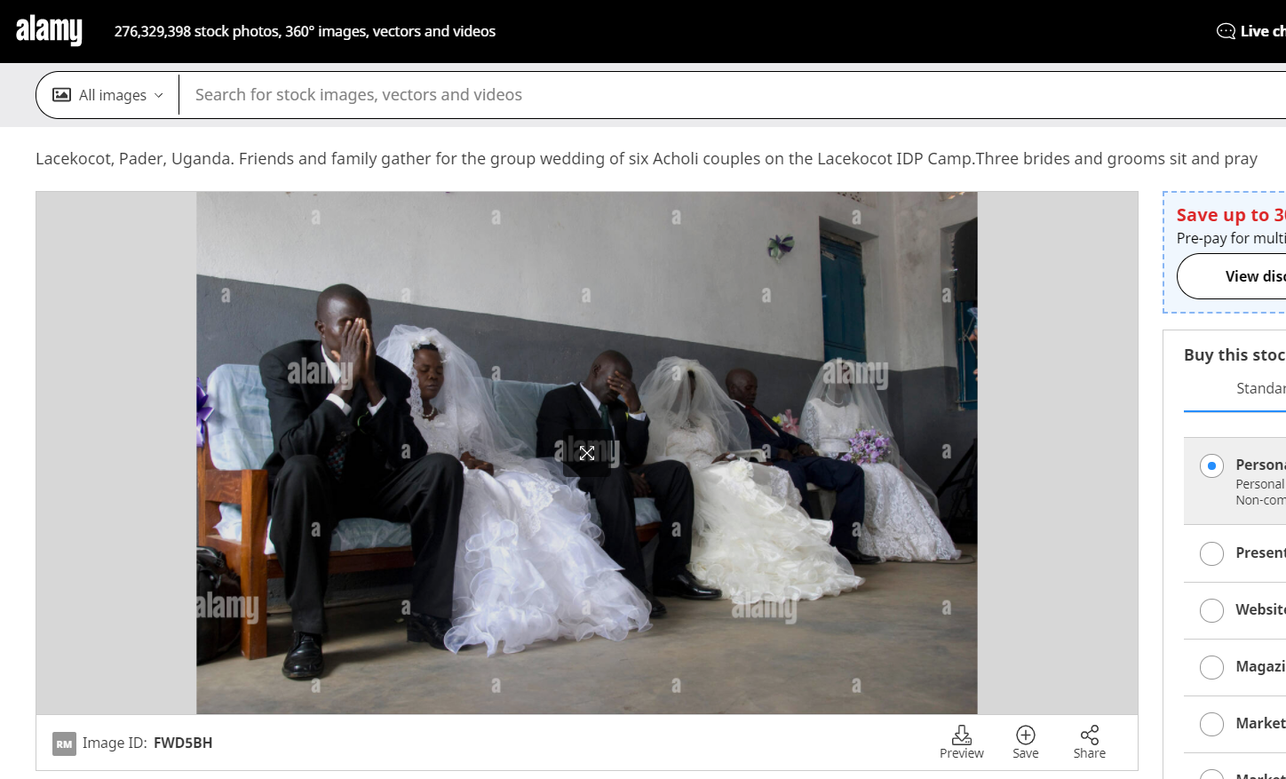 Yaptığımız araştırmalarda fotoğrafın orijinaline ulaştık. Alamy adlı bir stok görsel sitesinde yer alan fotoğraf, Becky Matthews tarafından 2009 yılında Uganda’da çekilmiş. Buradan fotoğrafın hikayesine dair pek çok bilgiye ulaşabiliyoruz. Uganda’nın Pader bölgesinde yer alan Lacekocot IDP Kampı’nda altı Acholi çiftinin grup düğünü için kilisede toplananlara dair bir fotoğraf dizisinde yer alan bu kare, düğün öncesi dua eden üç çifti gösteriyor.