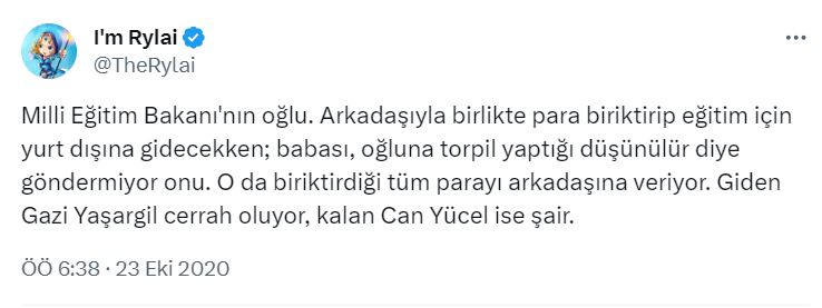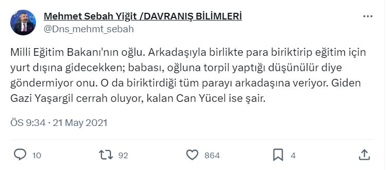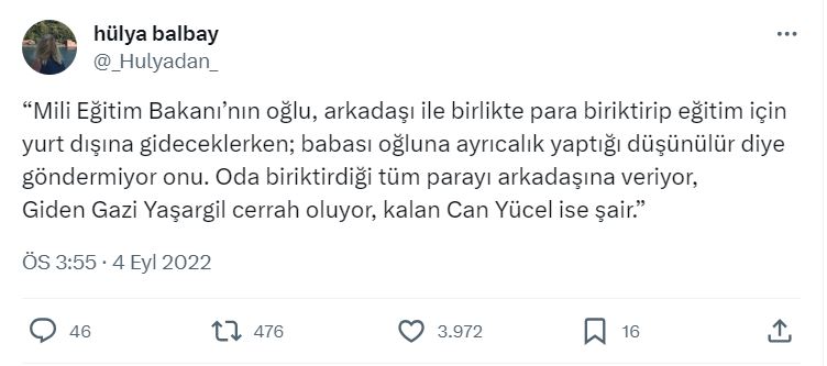 “Hayır yanlış, tamamen yanlış bir bilgi. Bunlar öğrenciyken harçlıklarını biriktiriyorlar. O gitti diye o da harçlıklarını çıkarıp ona veriyor. Seçme falan yok… Zaten o zamanlar için bir şehir efsanesi olmuş. Her efsanenin bir doğru tarafı bir de yalan tarafı vardır diye bitirelim…”