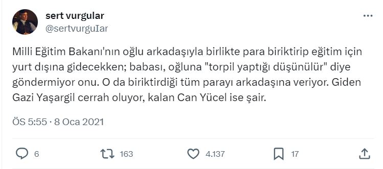 “Can Yücel yerine bana burs verildiği çok söyleniyor… Ama ikimize de burs verilmedi. İkimizde ailemizin imkânlarıyla yurtdışına çıktık. Can çok iyi arkadaşımdı.”