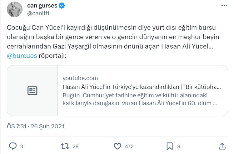 İddiaya göre Can Yücel biriktirdiği paralar ile yurt dışına gidecekken dönemin Milli Eğitim Bakanı Hasan Ali Yücel, ‘torpil ile oğlunu yurt dışına gönderdi’ algısının önüne geçmek için Can Yücel’e izin vermiyor. Ardından Can Yücel biriktirdiği paraları Gazi Yaşargil’e veriyor ve Yaşargil yurt dışı eğitimini tamamladıktan sonra cerrah olarak ülkesine geri dönüyor.