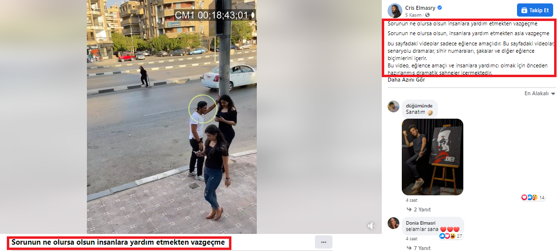 Cris Elmasry’nin 5 Kasım’da Facebook hesabından bu kez de iddia kaynağı videonun kurgu olduğunu doğrulayıcı açıklamalarda bulundu. Elmasry, videoyu: “Sorunun ne olursa olsun insanlara yardım etmekten asla vazgeçme” başlığı ile paylaştı.