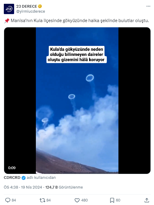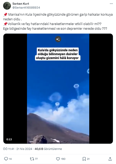 Geçtiğimiz günlerde sosyal medyada paylaşılan gökyüzündeki halka bulutu andıran şekilleri gösteren video gündem oldu. İddia sahipleri görüntünün Manisa, Kula’da kaydedildiğini iddia ederken gökyüzündeki şeklin ne olduğu ise anlaşılmadı. Videoyu paylaşan kimi hesaplar gökyüzünde oluşan bu fenomenin ne olduğuna dair sorular sordu; kimi bunun volkanik veya fay hareketleriyle ilişkili olduğunu iddia etti.