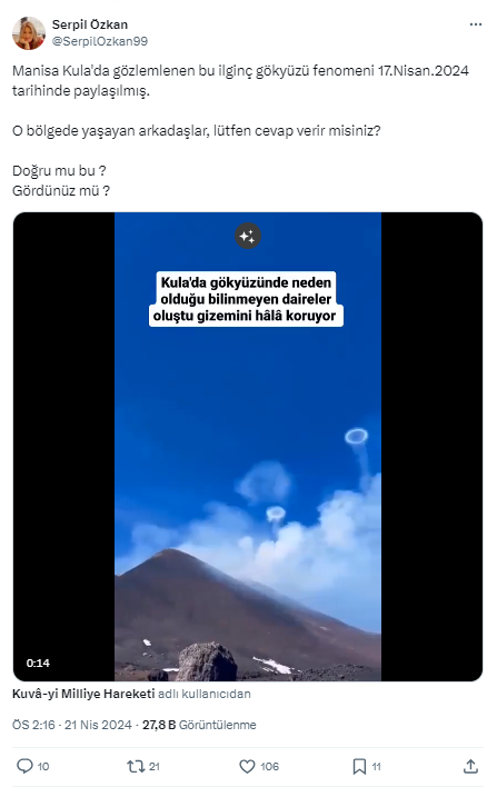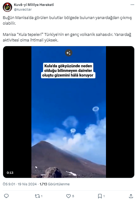 - Video, volkanik girdap halkalarını gösteriyor; ancak Manisa ilinin Kula ilçesinde kaydedilmedi.