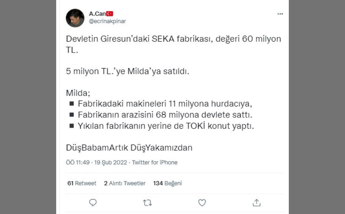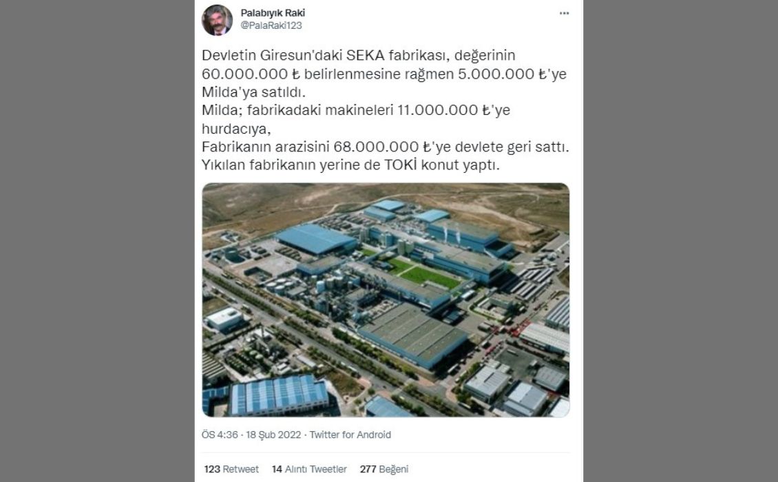 Sosyal medyada sıkça paylaşılan bir iddiada Giresun SEKA Fabrikası 5 milyon TL’ye özelleştirildiği söyleniyor. İddiaya göre fabrikaya 60 milyon TL değer biçilmişti. Daha sonra ise fabrikayı alan şirket, fabrikadaki makineleri 11 milyon TL’ye, fabrikanın arazisini de 68 milyon TL’ye devlete geri sattı. Devlete geri satılan araziye TOKİ’nin konut yaptığı da iddia edildi. İddia son birkaç yılda ara ara gündeme geliyor.