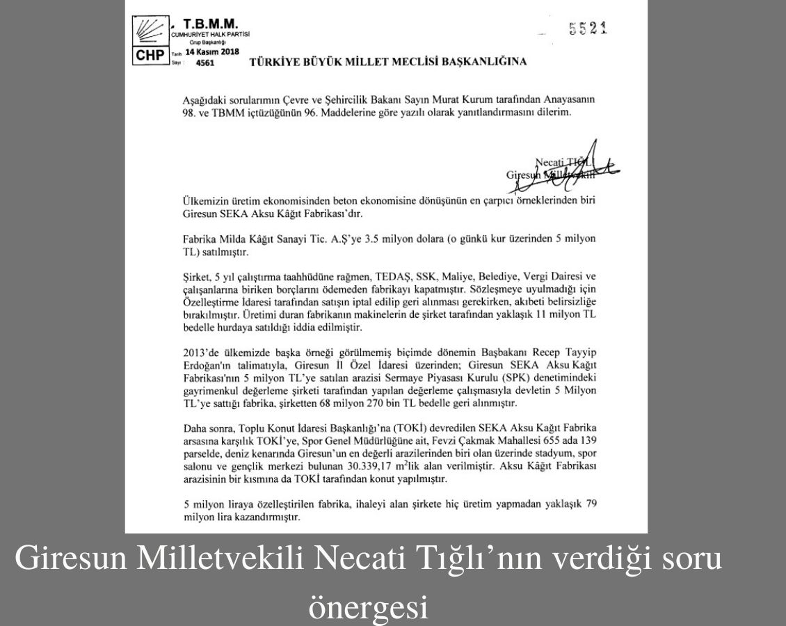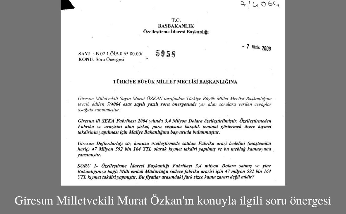 2013 yılında Giresun Aksu SEKA fabrikası Giresun İl Özel İdaresi’ne devrildi. Daha sonra fabrika Giresun İl Özel İdaresi’nden TOKİ’ye devredildi. Yine 2013 yılında Giresun Milletvekilli Selahattin Karaahmetoğlu devir ile ilgili meclise soru önergesi getirdi. (3. görsel) Önergeye cevap olarak Toplu Konut İdaresi Başkanlığı arazinin devir bedelinin 68,270 milyon TL olduğu belirtiyor. 2018 yılında ise Giresun Milletvekili Necati Tığlı’nın verdiği soru önergesinde (4. görsel) Milda Şirketi’nin fabrikanın içindeki makineleri de 11 milyon TL’ye sattığını ve böylelikle şirketin hiç üretim yapmadan 79 milyon dolar kar ettiği iddia edildi.