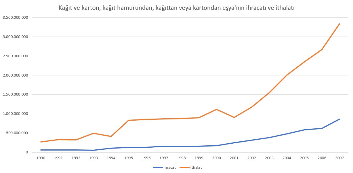 Yukarıdaki tablodan (7. görsel) anladığımız kadarıyla fabrika satılmadan öncede Türkiye’nin kağıt ithalatı yaptığını ama kağıt fabrikaları satıldıktan sonra giderek artan kağıt ithalatının artışını hızlandığını görüyoruz.