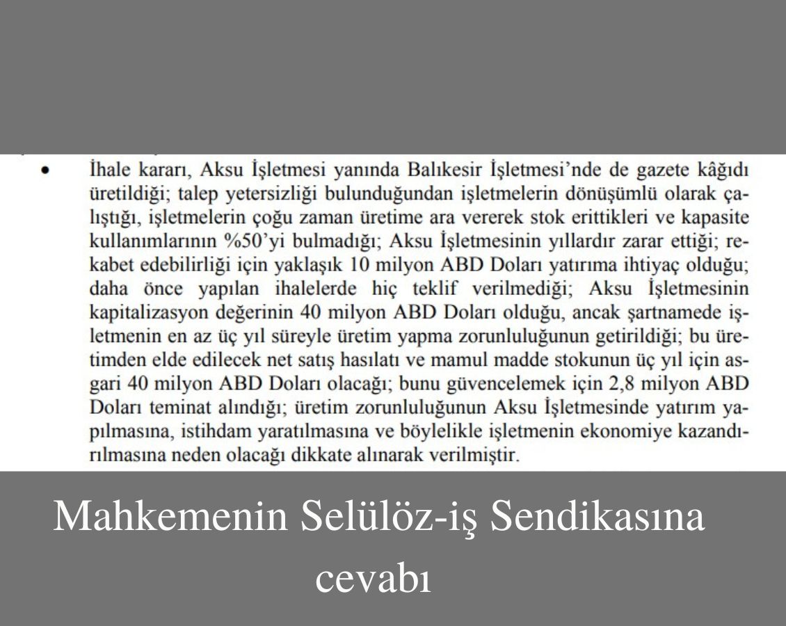Selülöz-İş Sendikası özelleştirmenin iptal edilmesi için Ordu İdare Mahkemesine başvurmuş. Mahkeme ise yukarıdaki ikinci görseldeki nedenlerden dolayı iptal istediğini reddetmiştir (2. görsel). Karar Danıştay’ın 13. Dairesi tarafından da onanmıştır.