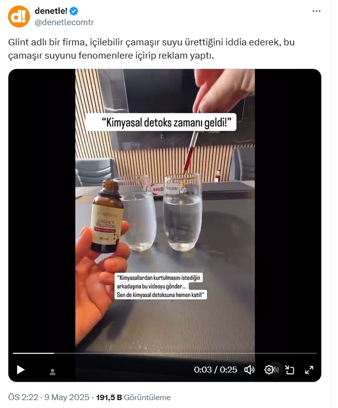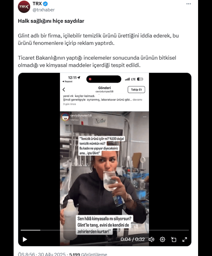 Son günlerde sosyal medyada dolaşan bir reklam kampanyası, kamuoyunda büyük tartışma yarattı. Glint adlı bir temizlik ürünleri markasının “içilebilir temizlik ürünü” ürettiği ve bu ürünü bazı fenomenlere ve marka üst düzey yöneticilerine içirerek tanıttığı iddiası gündeme geldi.