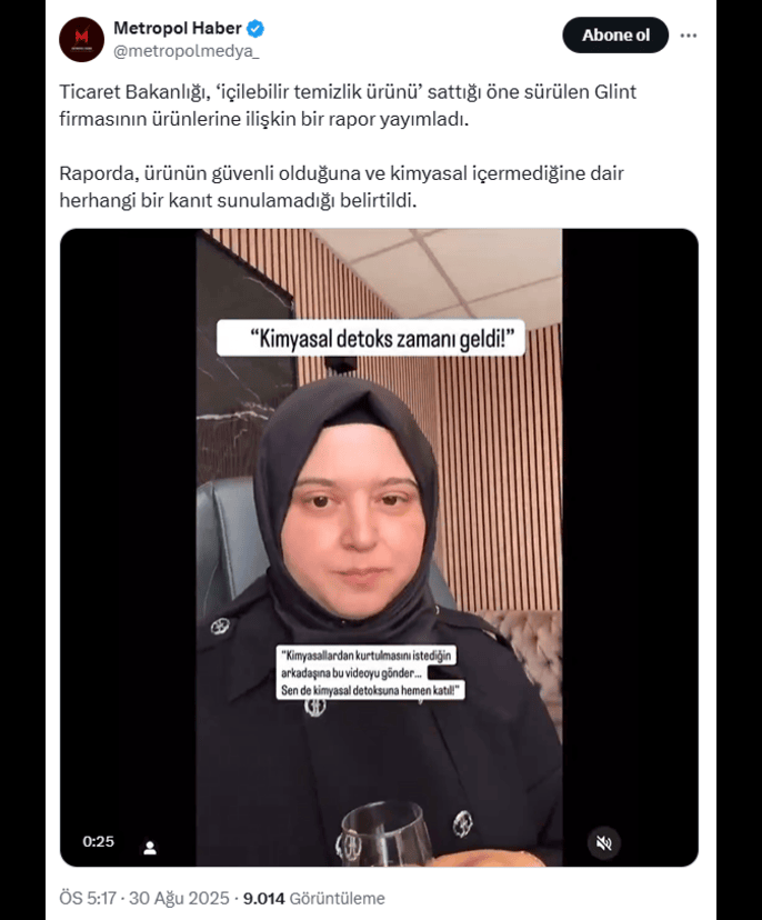 Üstelik Glint A.Ş. Yönetim Kurulu Başkanı Huriye Yılmaz’ın da bir videoda sözde bu ürünü içtiği görülüyor. Ancak bu tür eylemler, bilimsel olarak hiçbir geçerliliği olmayan, toplum sağlığı üzerinde çok ciddi sonuçlara yol açabilecek son derece tehlikeli yanlış örneklerdir.