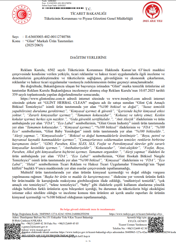 - Ticaret Bakanlığı ve Reklam Kurulu, Glint’in “%100 bitkisel”, “kimyasal içermez”, “FDA onaylı” gibi ifadelerini mevzuata aykırı buldu.