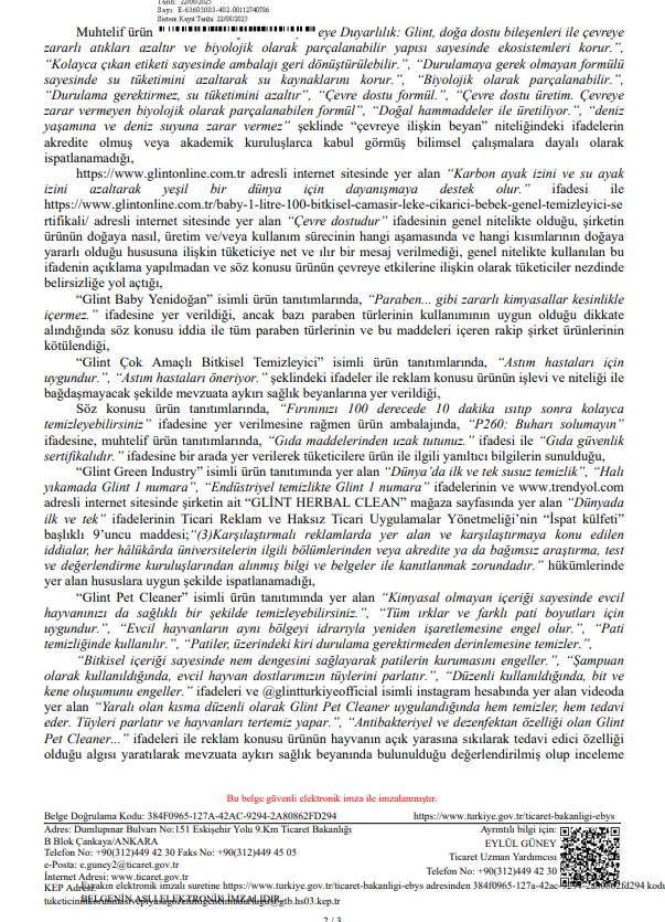 Belgelerde görüldüğü üzere dosya, T.C. Ticaret Bakanlığı’na bağlı Tüketicinin Korunması ve Piyasa Gözetimi Genel Müdürlüğü’nün ön incelemesiyle başlıyor ve Reklam Kurulu nezdinde yanıltıcı reklam bakımından değerlendiriliyor. Kurul, Glint’in internet sitesi ve ambalajlarında yer alan “%100 bitkisel”, “tamamen doğal”, “kimyasal içermez”, “GDO içermez”, “FDA onaylı”, “çevre dostu/biyolojik olarak parçalanabilir”, “astım hastaları için uygundur” gibi mutlak ve güven telkin eden ibareleri tek tek ele alıyor ve Ticari Reklam ve Haksız Ticari Uygulamalar Yönetmeliği uyarınca ispat yükünün reklam verende olduğu ilkesine dayanarak delillendirme arıyor. Dosyada bu iddiaları doğrulayacak nitelikte, bağımsız ve doğrulanabilir teknik raporlar, akredite test sonuçları, geçerli sertifikalar ve kapsam/netlik içeren metodolojiler sunulmadığı için ifadeler “kanıtlanmamış ve yanıltıcı” kabul ediliyor.