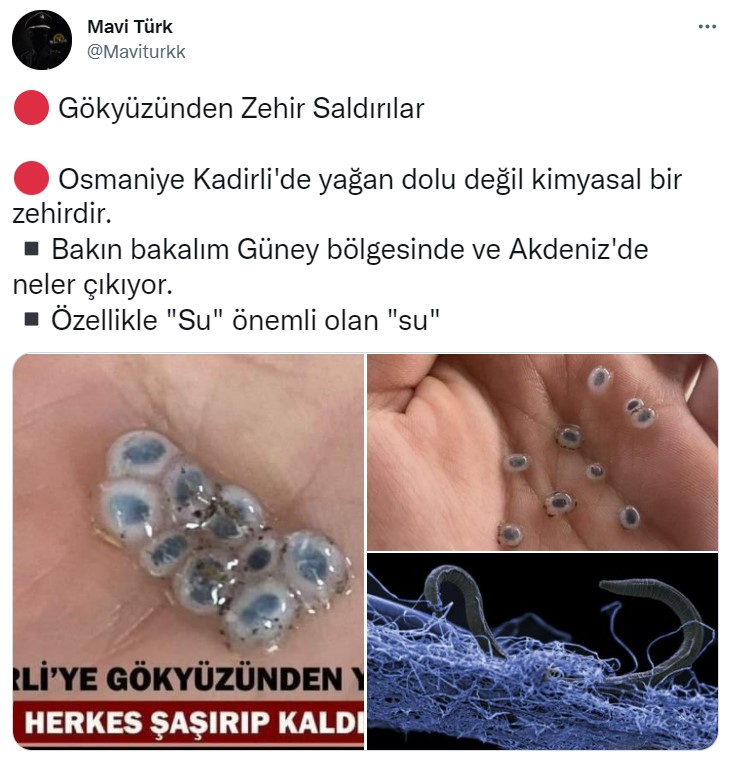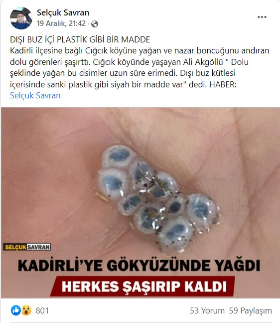 Twitter ve Facebook’ta yayılım gösteren bir fotoğrafta, gökten içinde siyah nokta içeren, plastik benzeri bir dokuya sahip dolu tanelerinin yağdığına dair bir açıklama paylaşılmış. Bu tuhaf doğa olayı ile ilgili gökten kimyasal zehir püskürtüldüğüne dair bazı iddialar görülüyor.