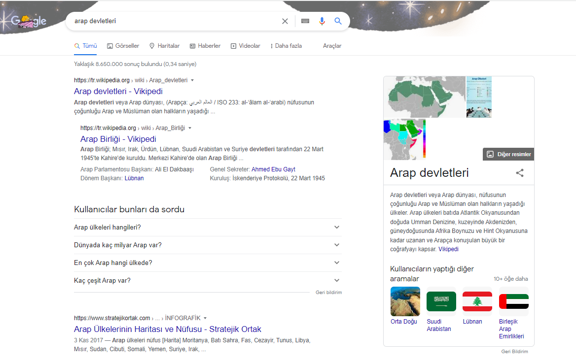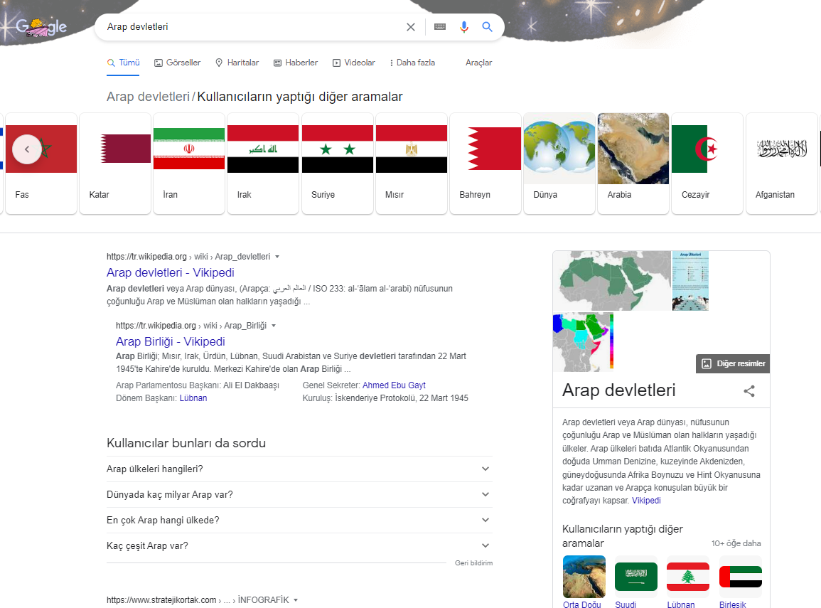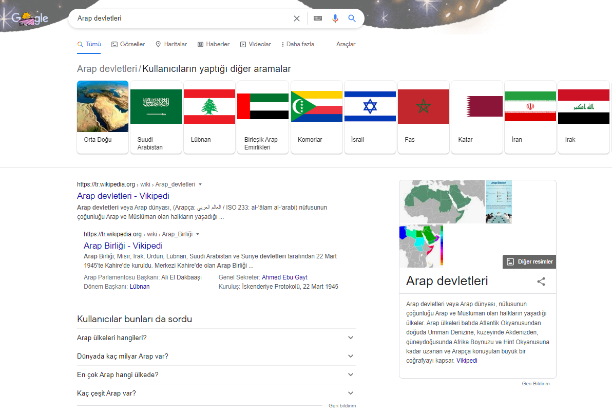 Google üzerinden ‘Arap devletleri’ aramasını yaptığımızda öncelikle Wikipedia gibi sitelerin arama sonucu olarak karşımıza çıktığını görüyoruz. ‘Kullanıcıların Yaptığı Diğer Aramalar’ başlığı ise sağ alt köşedeki kutucukta öneriler olarak karşımıza çıkmakta.