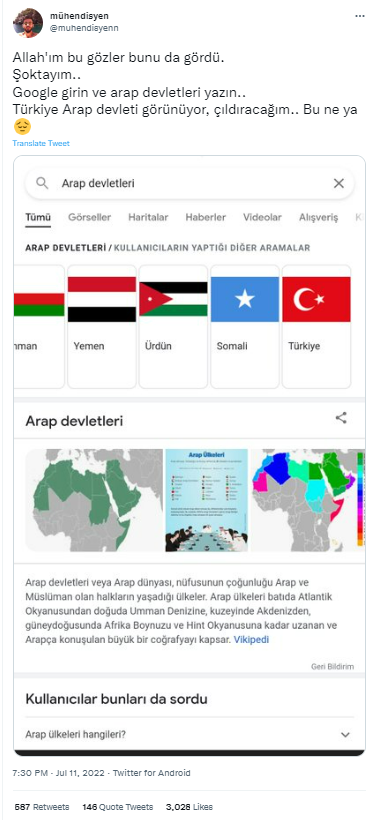 Yakın zamanda Twitter’da @muhendisyenn adlı hesabın yaptığı paylaşımda Google’nin Türkiye’yi Arap devleti olarak listelediği iddia edildi. Binlerce etkileşim alan paylaşım, @twit_Meclisi gibi farklı kullanıcılar tarafından tekrar paylaşılmaya devam edildi. Ayrıca Ekşi Sözlük’te ‘google’a arap devletleri yazınca türkiye çıkması‘ başlığı altında iddianın yayılımının devam ettiği görülmekte.