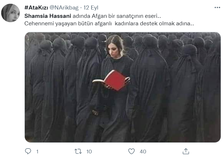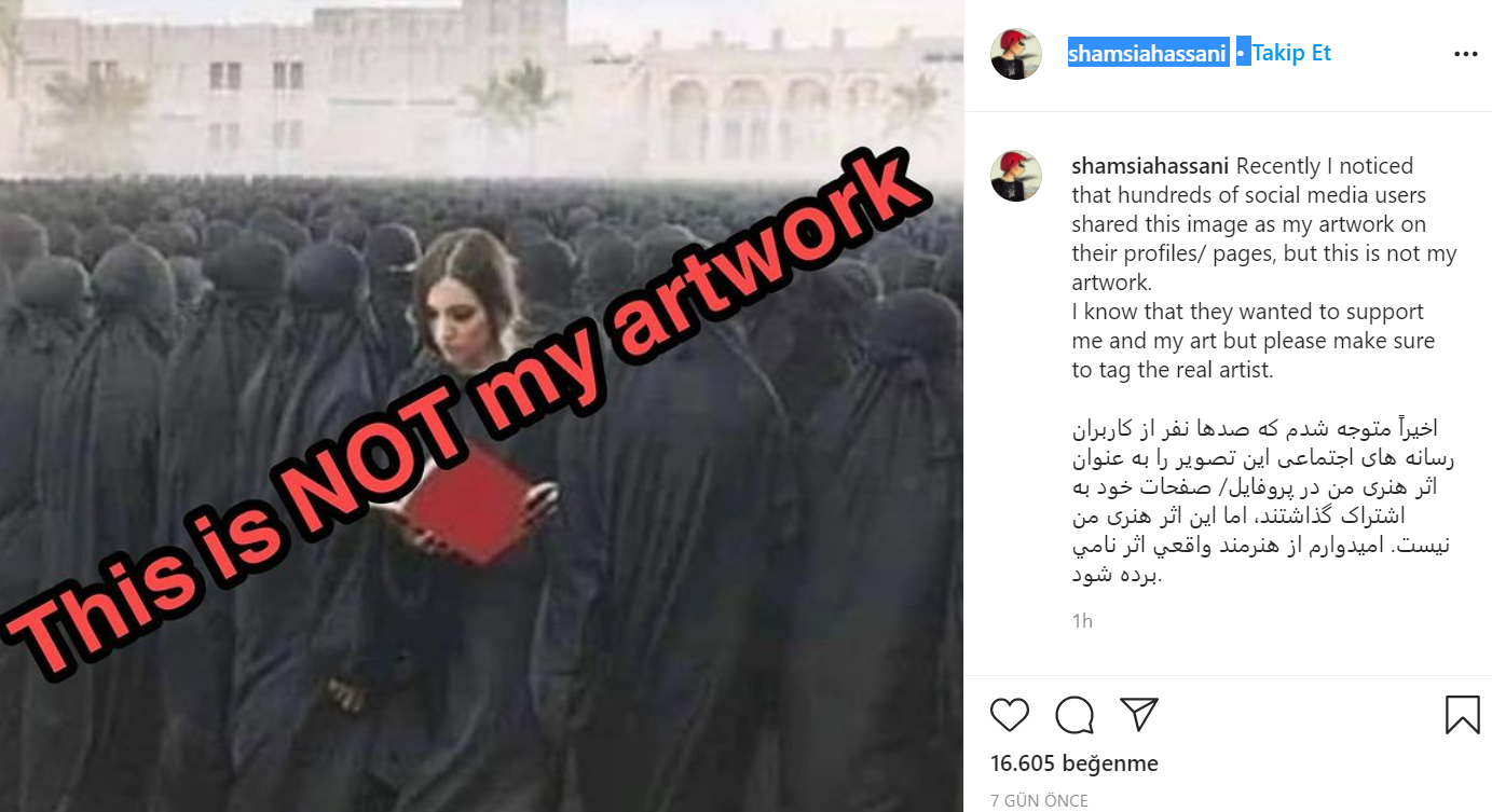 Paylaşım metnine; ”Shamsia Hassani adında Afgan bir sanatçının eseri.. Cehennemi yaşayan bütün afganlı kadınlara destek olmak adına..” yazılarak görselin bir direnişi simgelediği lanse edildi.