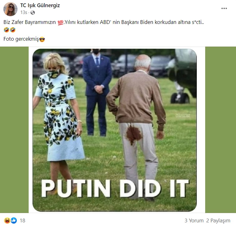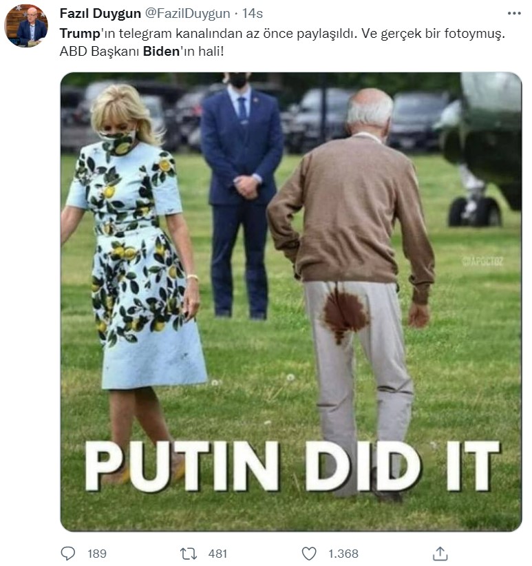 Görselde arkası dönük bir kişinin ABD Başkanı Joe Biden olduğu belirtildi. Paylaşım “Trump‘ın telegram kanalından az önce paylaşıldı. Ve gerçek bir fotoymuş. ABD Başkanı Biden‘ın hali!” açıklamasıyla paylaşıldı.