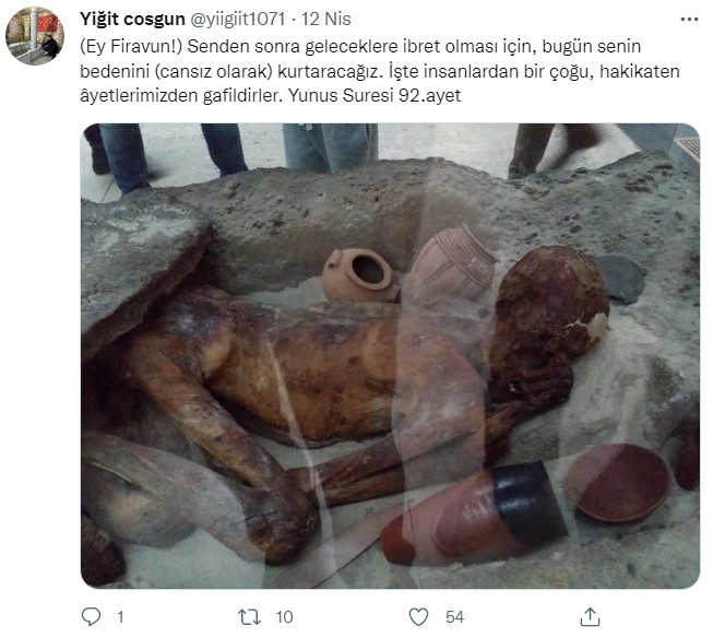 Sosyal medyada ve haber sitelerinde yıllardır paylaşılan bir fotoğrafta görülen mumyanın, semavi dinlerde geçen ve Musa peygamber döneminde yaşadığı belirtilen firavun olduğu söylenmektedir.