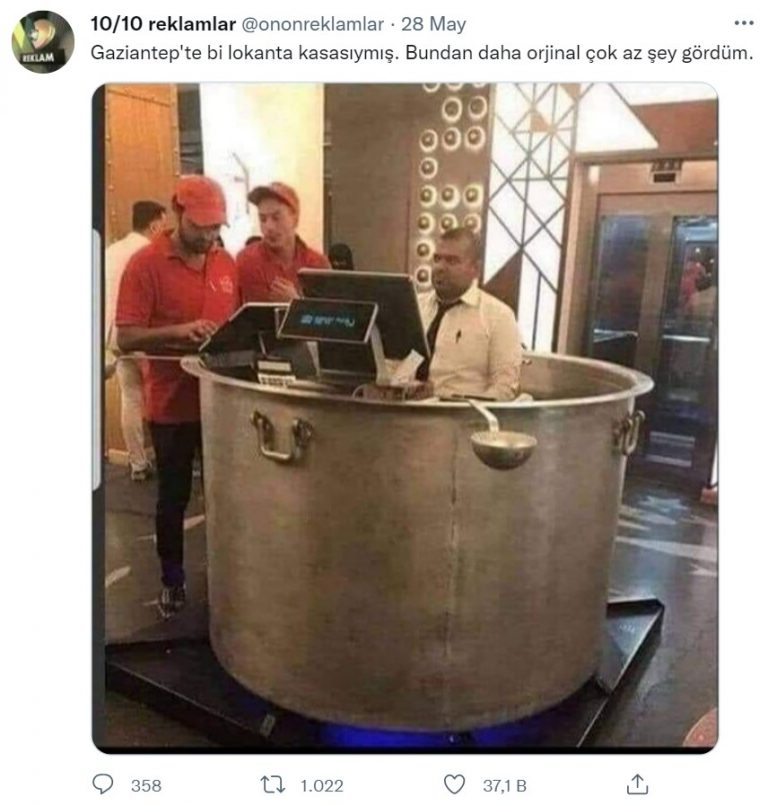 Buna benzer bir görüntünün Gaziantep’te bir lokantada kaydedildiği belirtilmiş. Paylaşımda olan fotoğrafta, bir kasa görevlisinin büyükçe bir kazanın içerisinde işlem yaptığı görülüyor.