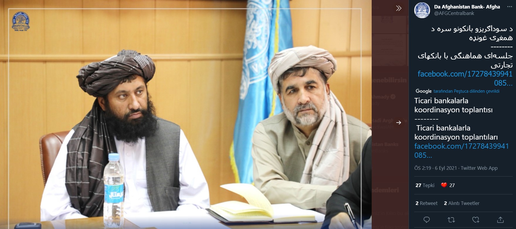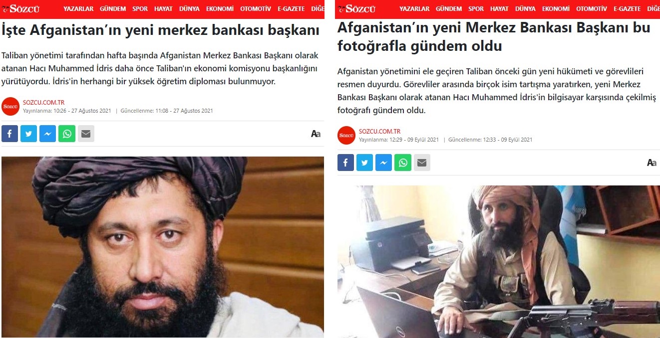 Afganistan Merkez Bankasının 1 Eylül’de gerçekleştirdiği, ülkenin finansal anlamda güçlenmesinin masaya yatırıldığı toplantının Hacı Muhammed İdris olarak bilinen, gerçek ismiyle Mulvi Abdul Kahir‘in yönettiği belirtilmektedir. DA Bank (Afganistan Merkez Bankası) Twitter hesabında da görüldüğü üzere toplantıyı yöneten kişinin (soldaki) internette yaygın olarak paylaşılan silahlı kişiyle aynı olmadığı görülmektedir.
